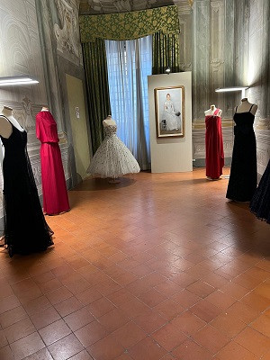 Questa mostra prende vita in uno spazio unico, che è esso stesso un'opera d’arte: la sala affrescata del prestigioso Palazzo Bernardini a Lucca. L’illusione architettonica delle colonne dipinte, ispirate alla grandiosità dell’arte classica, si slancia verso il soffitto e incornicia le pareti con eleganza, creando un’atmosfera suggestiva, in cui pittura e alta moda dialogano in perfetta armonia.