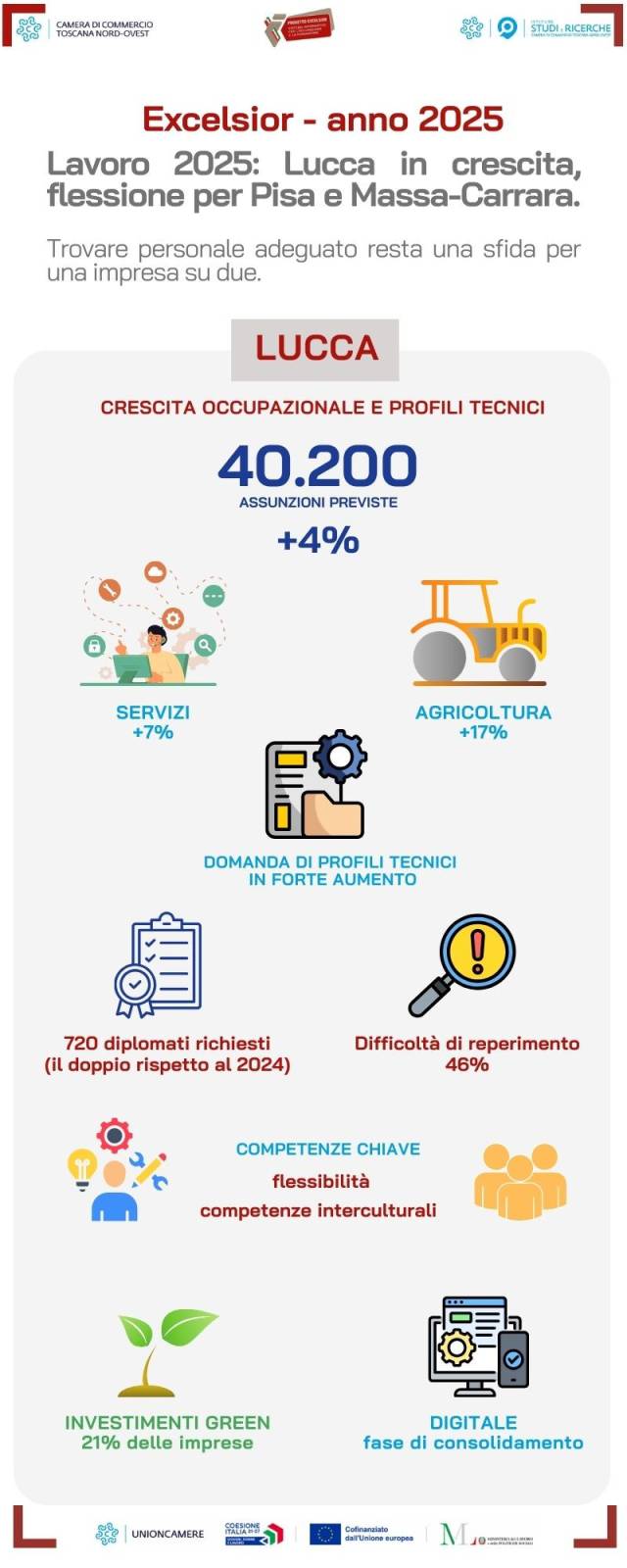 Il 2025 per il mercato del lavoro lucchese si è chiuso all'insegna del dinamismo, con le imprese che hanno programmato 40.200 nuovi ingressi, in crescita del 4% rispetto all'anno precedente. Questa vivacità occupazionale è stata alimentata principalmente dal settore dei servizi, per il quale si è rilevata una crescita del 7% nelle assunzioni, e dell'agricoltura (+17%), mentre l'industria ha mostrato un lieve calo (-3%). In questo scenario, favorevole in termini quantitativi, le imprese stanno evolvendo anche in qualità ricalibrando le proprie strategie di selezione con una forte domanda di profili tecnici: le richieste di diplomati provenienti dagli ITS Academy (720) risultano raddoppiate rispetto al 2024. Nonostante un lieve miglioramento, le difficoltà di reperimento restano elevate (46%), con le aziende orientate a dare priorità a competenze trasversali come la flessibilità (63%). Sul fronte dell'innovazione, il territorio sembra aver scelto una fase di consolidamento delle tecnologie digitali, mentre gli investimenti green si assestano al 21%, mantenendo un ruolo strategico per la competitività delle industrie locali.