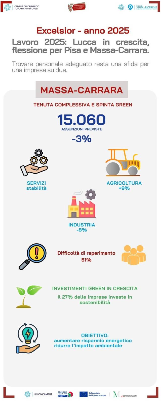 In provincia di Massa-Carrara, con 15.060 assunzioni previste, le imprese hanno delineato un 2025 all'insegna di una contrazione contenuta (-3%). Se da un lato il comparto industriale ha risentito di una fase di assestamento (-8%), in particolare nei settori estrattivo (-21%), metalmeccanico (-9%) e delle costruzioni (-6%), dall'altro la stabilità complessiva dei servizi e il trend positivo dell'agricoltura (+9%) hanno contribuito a contenere la flessione. Resta critico, e in lieve peggioramento, il nodo della difficoltà di reperimento del personale, che interessa il 51% delle entrate programmate (+1 punto percentuale). Segnali positivi arrivano dalla transizione ecologica: cresce la quota di imprese, specialmente nei servizi e nell'agricoltura, che hanno deciso di puntare su tecnologie green, portando al 27% la media provinciale degli investitori in tecnologie sostenibili per aumentare il risparmio energetico e ridurre l'impatto ambientale.