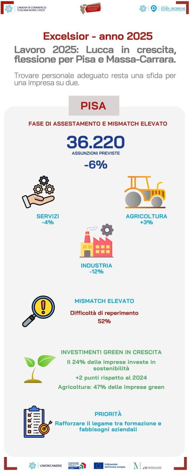 Le previsioni annuali per la provincia di Pisa descrivono un mercato del lavoro in fase di assestamento nel 2025, con 36.220 nuovi ingressi e una flessione del 6% rispetto all'anno precedente. Il calo ha interessato trasversalmente i macro-settori: l'industria ha ridotto le previsioni di assunzioni del 12%, risentendo della contrazione in comparti chiave come la moda (-18%), la metalmeccanica (-14%) e le costruzioni (-8%). Anche i servizi hanno mostrato una flessione (-4%), con il commercio in calo del 7%. Unica nota positiva arriva dall'agricoltura (+3%). Sul fronte della sostenibilità si registra un lieve rafforzamento: il 24% delle imprese investitrici ha orientato le proprie risorse verso soluzioni green (contro il 22% del 2024), con punte del 47% nel settore agricolo. Pisa registra tuttavia la quota più alta di posizioni di difficile reperimento tra le tre province (52%), rendendo sempre più prioritario l'incontro tra formazione e fabbisogni aziendali delle imprese.