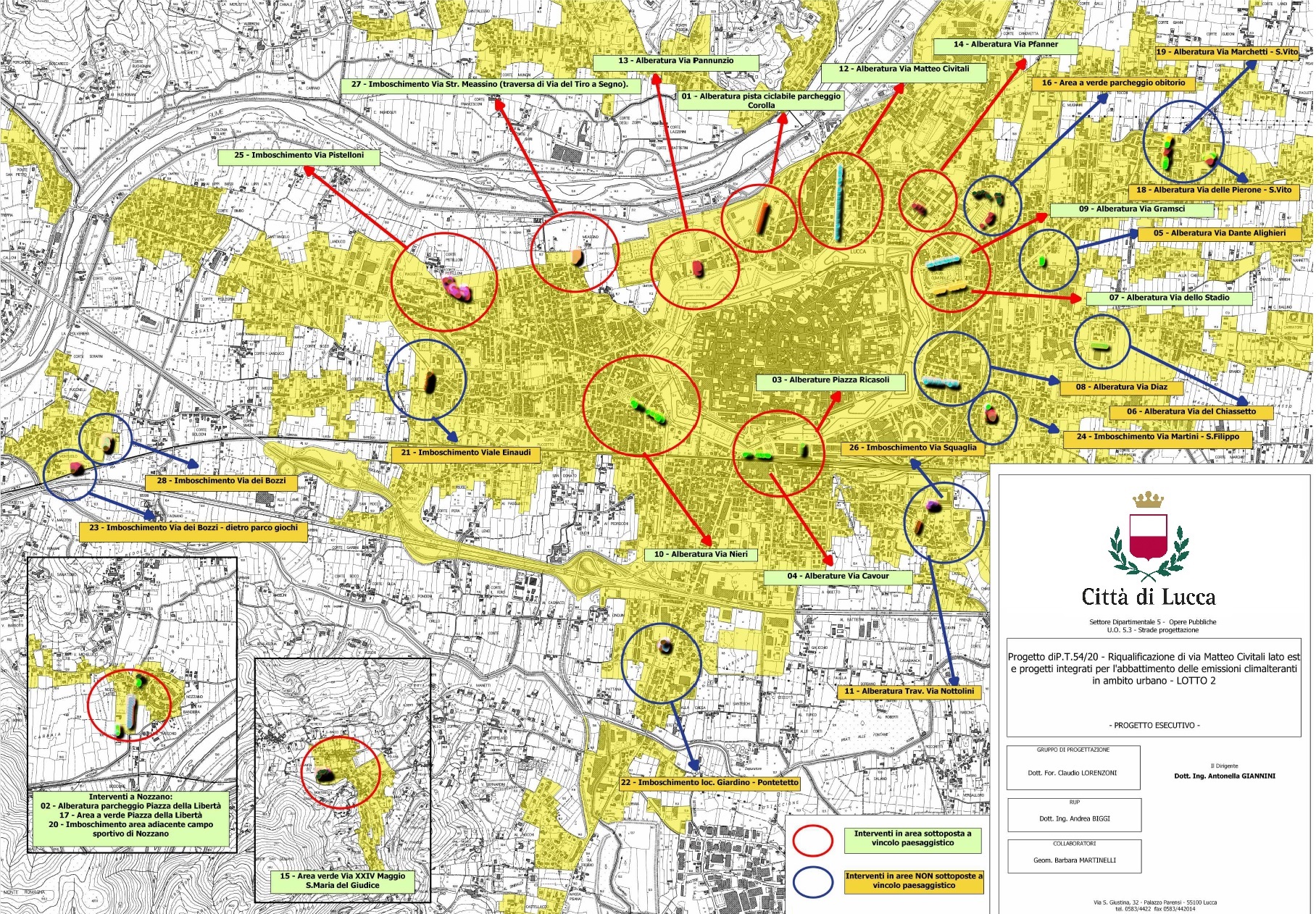 In seguito saranno messe a dimora nuove alberature anche lungo le strade: platani in via Cavour, bagolari sul lato est di piazzale Ricasoli, tigli in via Nieri, aceri in via Pannunzio, liquidambar lungo la pista ciclabile al parcheggio Corolla, piante di acero riccio in via Pfanner, in via Gramsci alberi di ligustro lucido e carpini bianchi piramidali, gingko biloba in via dello Stadio; carpini bianchi piramidali in via Diaz, tigli in via Dante Alighieri, bagolari in via del Chiassetto. All'interno di aree aree verdi, parchi e giardini pubblici saranno messi a dimora lecci in piazza della Libertà a Nozzano, aceri ricci, ciliegi, tigli, meli da fiore, noccioli, sofore a Santa Maria del Giudice, nell'area a verde di via XXIV Maggio, con rimboschimento anche del terreno incolto adiacente, aceri ricci e lecci nell'area a verde adiacente all'obitorio, piante di varie specie, fra cui querce piramidali e tigli, nell'area a verde adiacente alle scuole in via Marchetti, aceri e tigli in due aree a verde di via dei Pieroni a San Vito. Infine per le alberature in aree verdi marginali e non strutturate, saranno piantati; ontani, ciliegi e noci in via Meassino; farnie e frassini in un'area adiacente al campo sportivo di Nozzano; farnie e frassini in un'area a verde di forma triangolare in via del Bozzo a Sant'Angelo; farnie in via Einaudi.