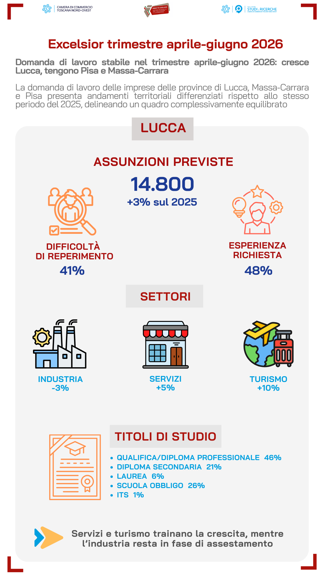 In provincia di Lucca, nel trimestre aprile-giugno 2026, le assunzioni programmate dalle imprese con dipendenti ammontano a 14.800 unità, in lieve aumento rispetto allo stesso periodo del 2025 (+3%, pari a 440 unità in più). Le imprese segnalano difficoltà di reperimento per il 41% delle posizioni, in calo rispetto all'anno precedente, mentre un'esperienza pregressa nel settore è richiesta in oltre il 48% dei casi. Per quanto riguarda i titoli di studio, il 21% delle assunzioni è rivolto a candidati con diploma di scuola secondaria, il 46% a figure con qualifica o diploma professionale, mentre la domanda di laureati si attesta al 6%. Per il 26% delle posizioni è sufficiente la scuola dell'obbligo, mentre i titoli ITS rappresentano l'1%. Tra i settori, l'industria registra una lieve contrazione (-3%), mentre i servizi risultano in crescita (+5%), con 11.430 assunzioni programmate. All'interno dei servizi si evidenzia una dinamica particolarmente positiva del turismo, che con 5.080 ingressi previsti segna un incremento del 10%.