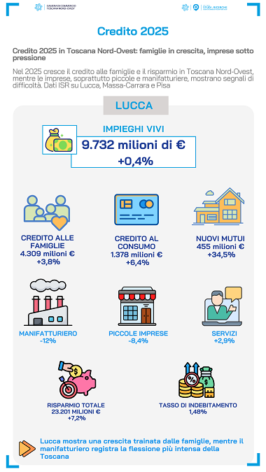 La provincia di Lucca ha chiuso il 2025 con impieghi vivi pari a 9.732 milioni di euro, in modesta crescita dello 0,4%. La tenuta degli impieghi è stata sostenuta principalmente dal credito alle famiglie consumatrici (4.309 milioni, +3,8%), dal credito al consumo (1.378 milioni, +6,4%) e dai mutui per acquisto abitazioni (455 milioni di nuove erogazioni, +34,5%). Sul fronte delle imprese, il comparto manifatturiero ha registrato la flessione più pesante in Toscana segnando un -12% (1.648 milioni), mentre le piccole imprese sotto 20 addetti sono scese a 701 milioni (-8,4%). In positivo, il settore dei servizi ha raggiunto 3.111 milioni (+2,9%), confermando il primato regionale.