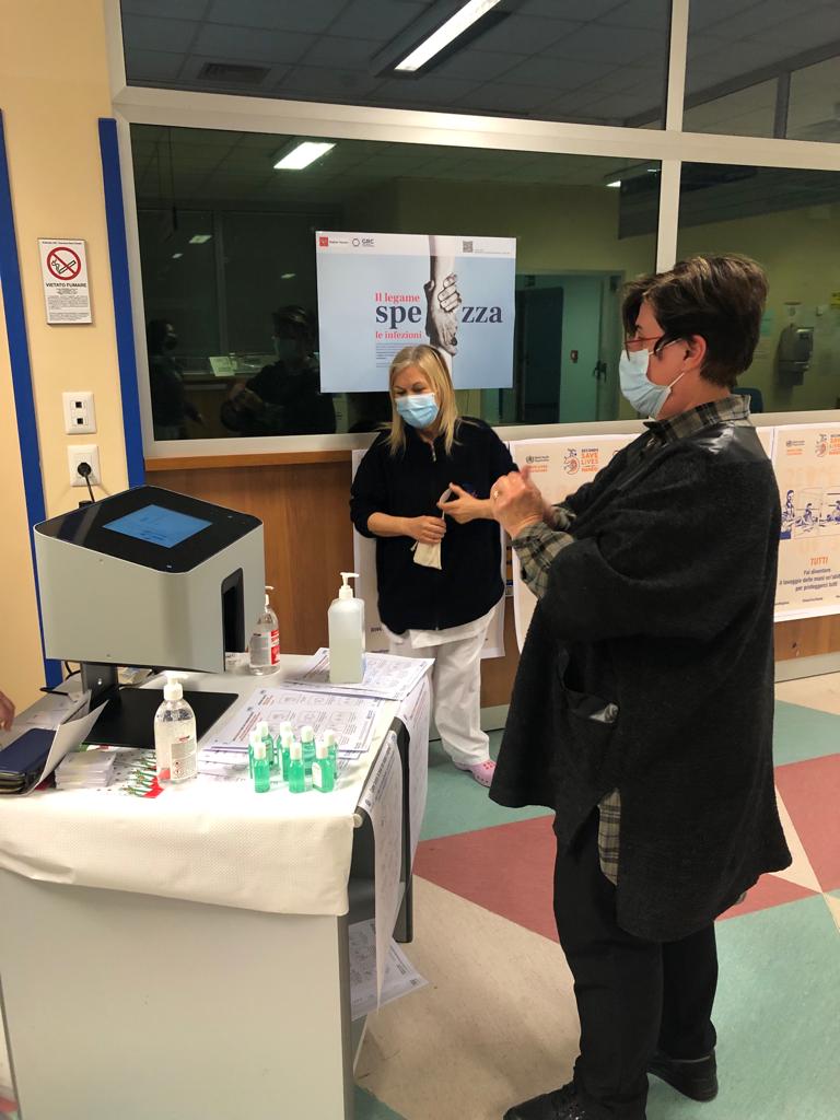 Negli ospedali di Massa, Viareggio, Livorno e Cecina sono state fatte dimostrazione con uno scanner digitale in grado di rilevare la percentuale di pulizia delle proprie mani per evidenziare come una disinfezione sommaria e frettolosa sia insufficiente ad eliminare i fattori di rischio dovuti a scarsa igiene. La macchina propone una scannerizzazione a colori delle proprie mani dopo aver utilizzato il gel: la parte in verde significa che è stata igienizzata in maniera adeguata, quella rossa è ancora sporca. In pochi secondi viene così offerta un’immagine che non sono fornisce il reale stato di pulizia delle mani, ma indica anche quali “movimenti” compiere per migliorare il nostro risultato.