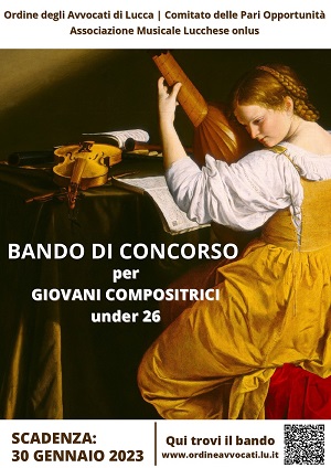 L'ordine degli avvocati di Lucca, in collaborazione con il suo Comitato per le Pari Opportunità e l'Associazione Musicale Lucchese, ha indetto un concorso per giovani donne compositrici. C'è tempo fino al 30 gennaio 2023 per presentare la domanda e concorrere nelle due categorie previste che sono under 18 e under 26. Come annunciato in settembre, in occasione della conferenza dedicata alla discriminazione che per secoli ha limitato le donne autrici di musica, le tre realtà sono riuscite a organizzare questo concorso che vuole sostenere e incoraggiare il talento al femminile nella musica.
