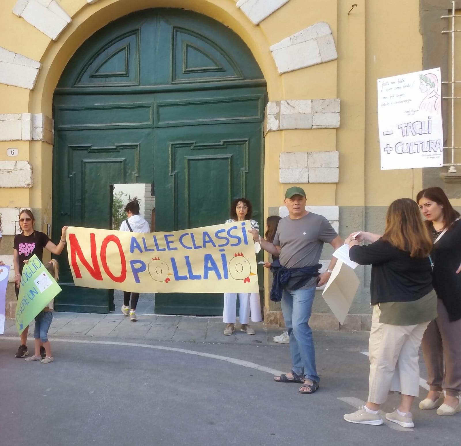 Mattina di protesta davanti all'ingresso della scuola media Carducci di piazza San Ponziano. Un presidio formato da alcuni docenti e da personale Ata della scuola è stato realizzato come forma di adesione allo sciopero nazionale indetto contro le cosiddette 'classi pollaio' e i tagli alla scuola disposti dal Governo.