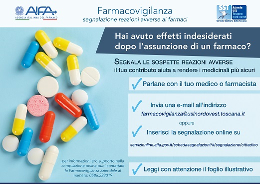 A partire da questa settimana l'Azienda USL Toscana nord ovest lancia la campagna per sensibilizzare i cittadini a segnalare in maniera spontanea le reazioni avverse ad un farmaco.