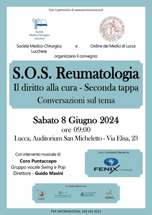 La Società Medico Chirurgica Lucchese invita a partecipare, sabato 8 giugno dalle ore 9, a un importante momento di confronto sulle difficoltà che sta vivendo il sistema sanitario nazionale a tema S.O.S. Reumatologia il diritto alla cura, stilando un primo bilancio ad un anno dalla prima edizione del convegno. Organizzato con il patrocinio e la collaborazione dell'Ordine dei Medici di Lucca, in collaborazione, con l'associazione Toscana Malattie Reumatiche – ATMaR, l'associazione Archimede, l'Associazione lucchese Arte e Psicologia Alap, il Centro studi e ricerche prof. Gugliemo Lippi Francesconi e con il contributo liberale e non condizionante di Fenix Pharma e il patrocinio della Provincia di Lucca.