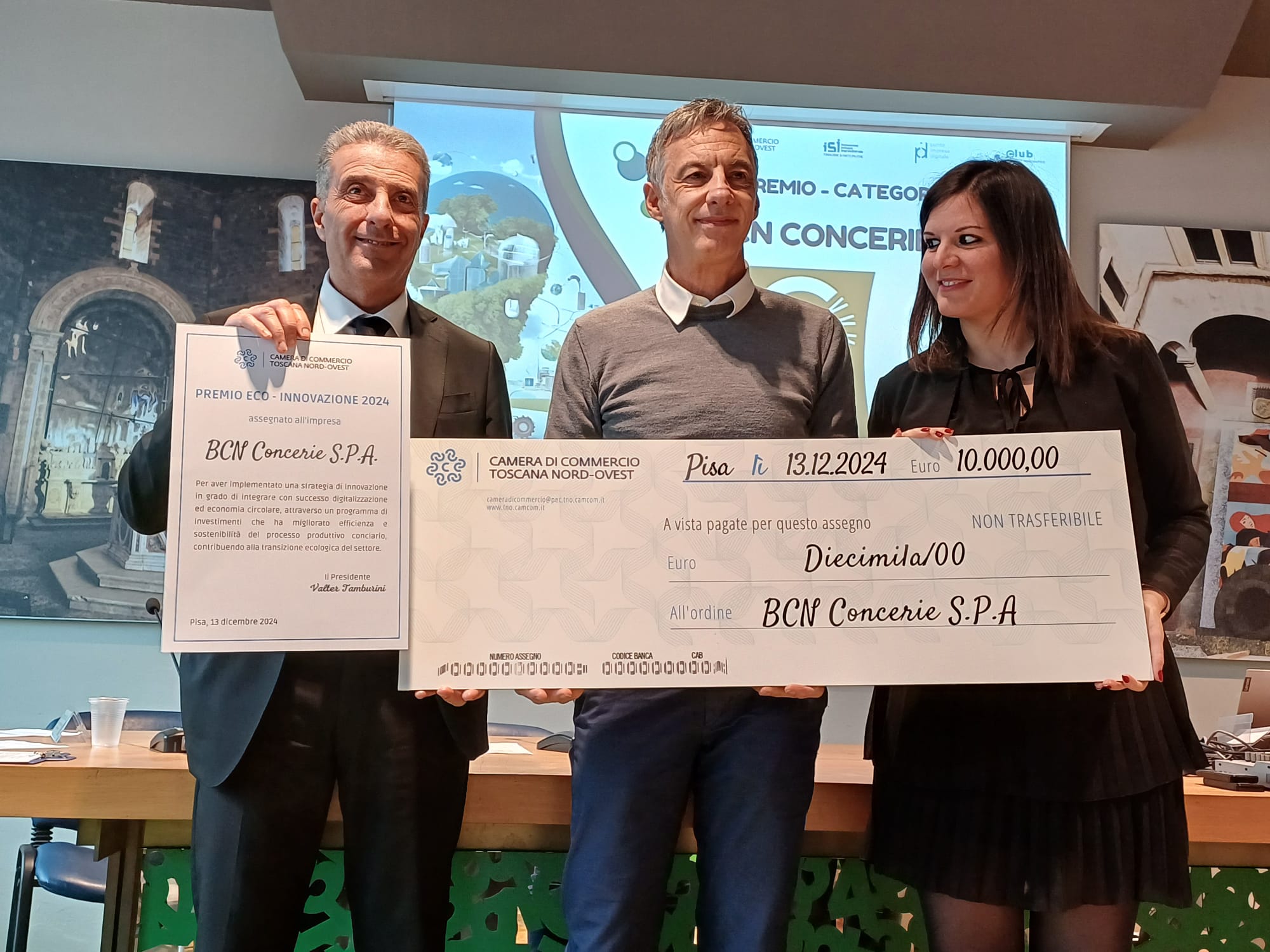 BCN Concerie Spa con sede a S.Croce Sull'Arno (Pisa), per la sezione PMI "per aver implementato una strategia di innovazione in grado di integrare con successo digitalizzazione ed economia circolare, attraverso un programma di investimenti che ha migliorato efficienza e sostenibilità del processo produttivo conciario, contribuendo alla transizione ecologica del settore".