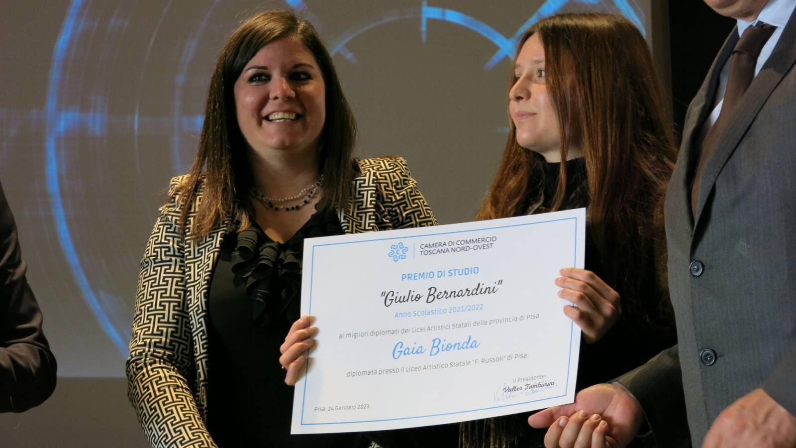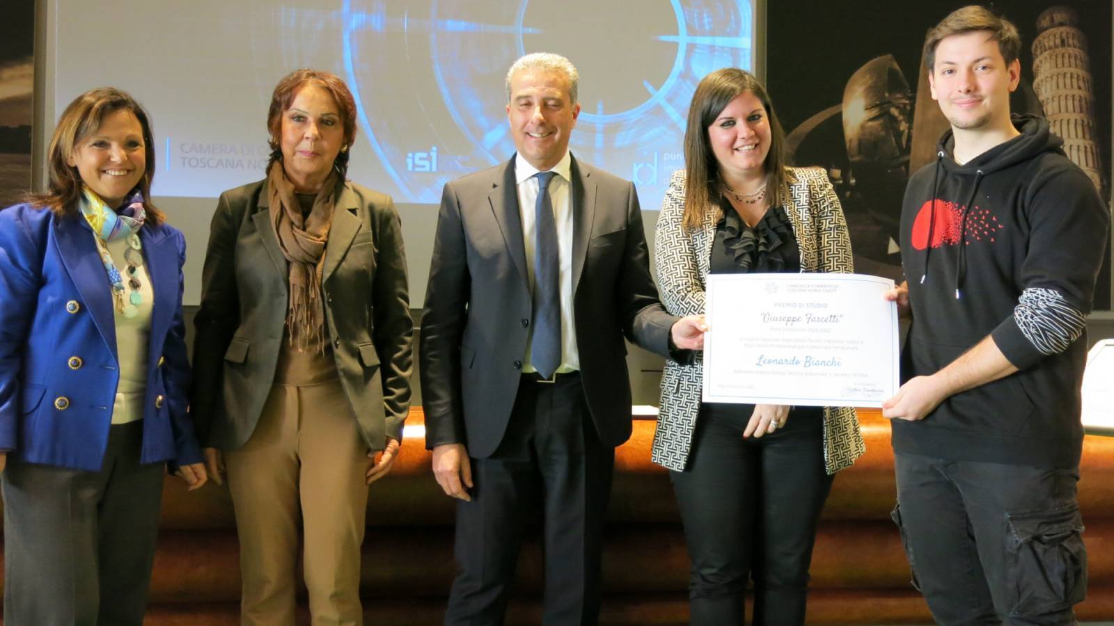 La giornata di oggi è stata anche importante per la consegna dei Premi di Studio "Giuseppe Fascetti" e "Giulio Bernardini" a dieci studenti diplomati nell'anno scolastico 2021-22 presso gli Istituti Tecnici e d'Arte della provincia di Pisa. Un riconoscimento che la Camera di commercio, tra le tante iniziative per l'orientamento dei giovani, anticipando in tempi rispetto ad altri enti, ha istituito per premiare e valorizzare i tecnici migliori in uscita dalle scuole professionali e tecno-industriali della provincia, ovvero quelle le figure professionali tra le più ricercate dalle imprese, caratteristica che rappresenta l'elemento di forza e di valore degli stessi premi studio nati, rispettivamente, nel 1989 e nel 1954 e dedicati alla memoria di membri di Giunta camerale.
