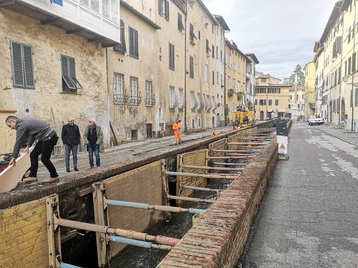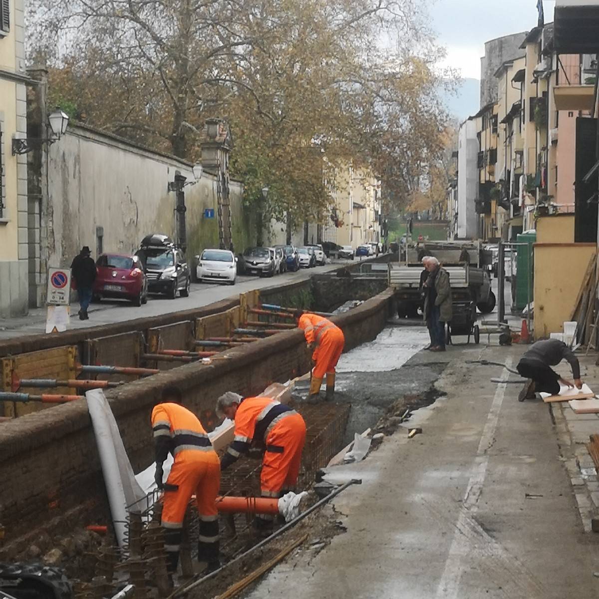 Proseguono in modo spedito i lavori di consolidamento del tratto di via del Fosso fra la Madonna dello Stellario e traversa con via San Nicolao chiuso da alcuni anni per il cedimento della superficie stradale e per il pericolo di degrado della spalletta del Condotto pubblico.
