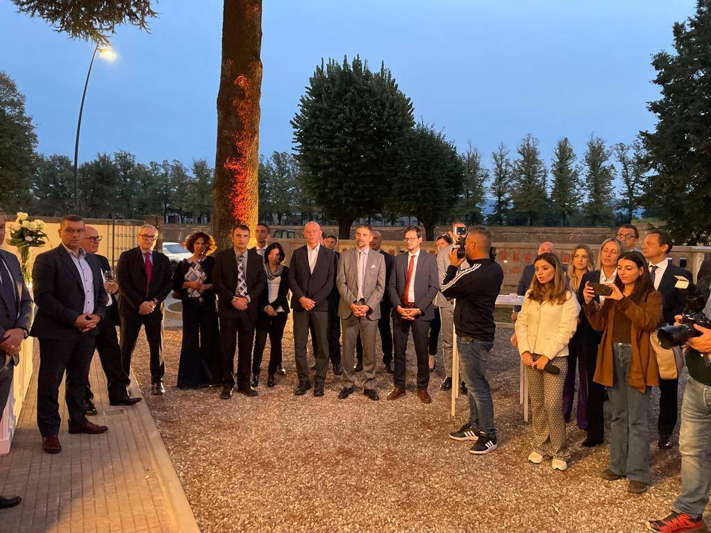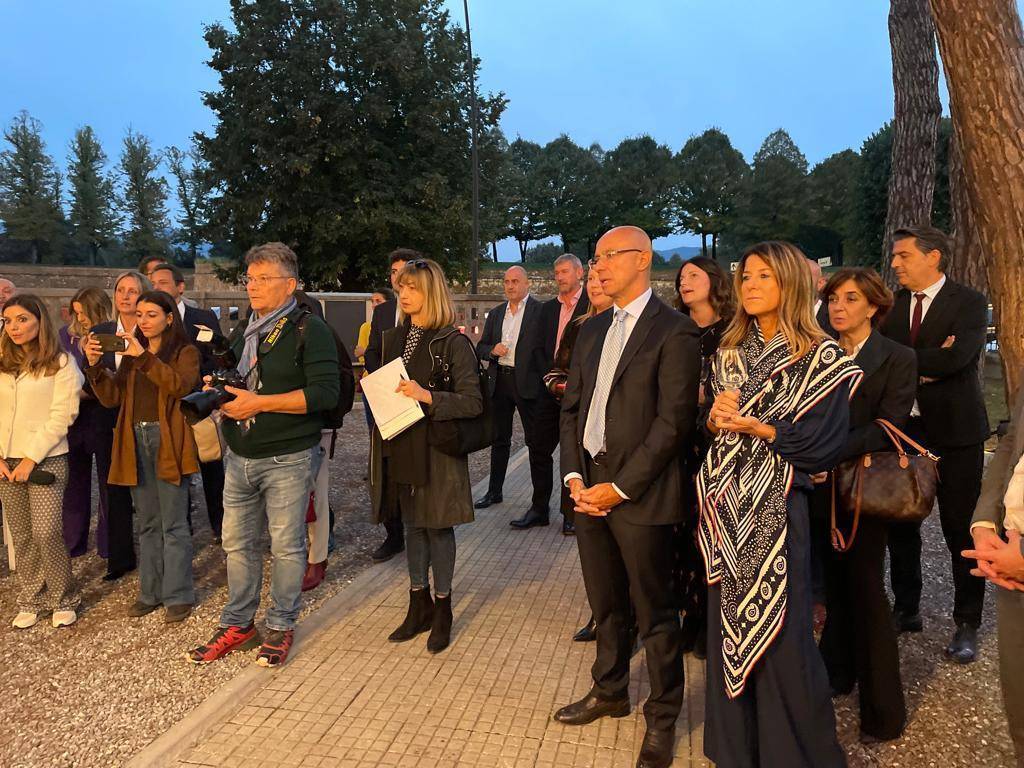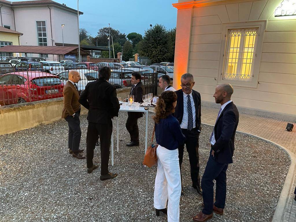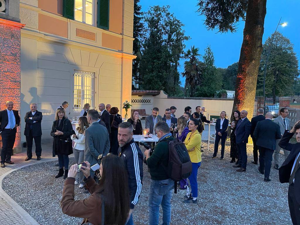 Serata mite e illuminata dalle luci diffuse nel giardino della villa che accoglierà i clienti lucchesi. Niente male il buffet e brindisi collettivo per tutti i presenti.