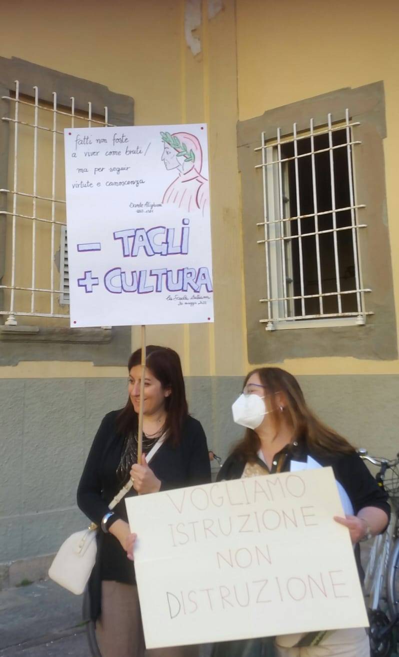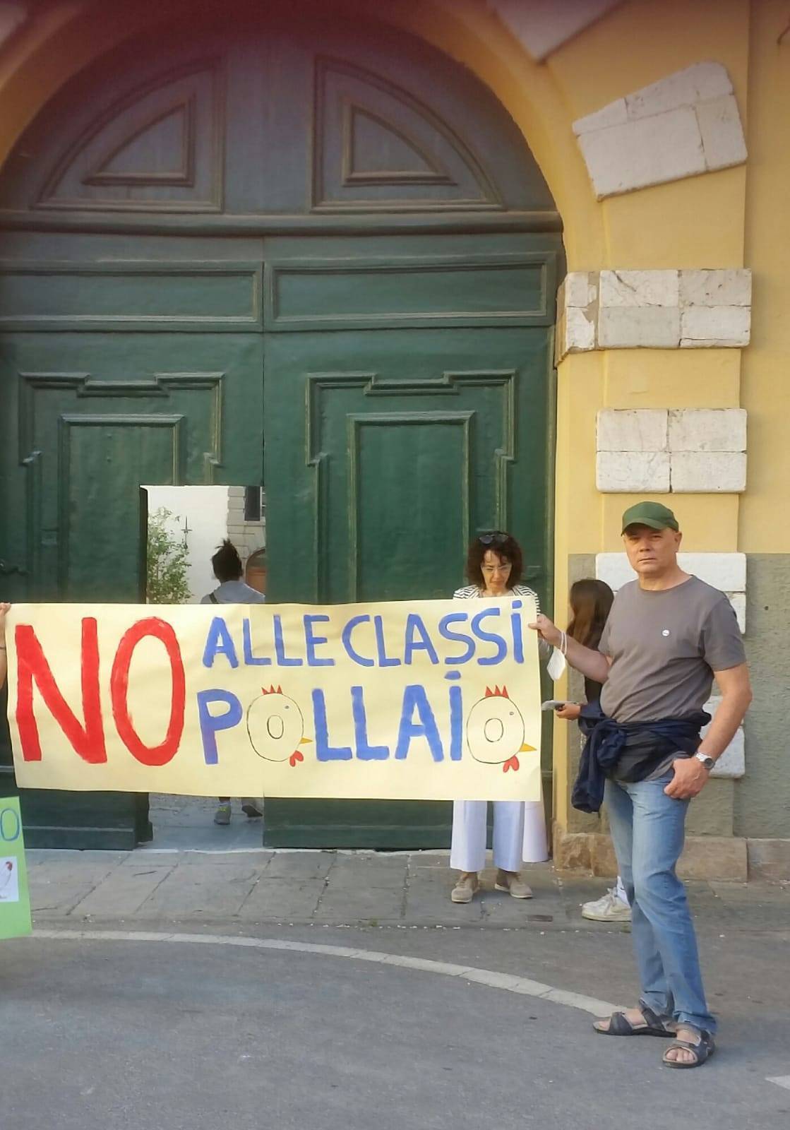 Mattina di protesta davanti all'ingresso della scuola media Carducci di piazza San Ponziano. Un presidio formato da alcuni docenti e da personale Ata della scuola è stato realizzato come forma di adesione allo sciopero nazionale indetto contro le cosiddette 'classi pollaio' e i tagli alla scuola disposti dal Governo.