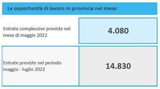 Le incertezze e i timori per l'andamento della crescita economica frenano i programmi occupazionali dell'industria che ha programmato solo 560 ingressi a maggio (390 nel manifatturiero e 170 nelle costruzioni), un valore in calo rispetto ad aprile (690) per la diminuzione del manifatturiero, e inferiore anche all'anno precedente (860). I servizi prevedono 3.520 entrate in azienda, con aumenti in tutti i comparti: cresce la domanda di lavoro nel turismo (1.060, +270 circa rispetto a maggio 2021 quando erano ancora in vigore le misure restrittive per il contenimento dei contagi) e nei servizi alle persone (1.190 assunzioni, +770 rispetto a maggio 2021), ma anche nei servizi alle imprese (790; +390) e nel commercio (480; +70 entrate).