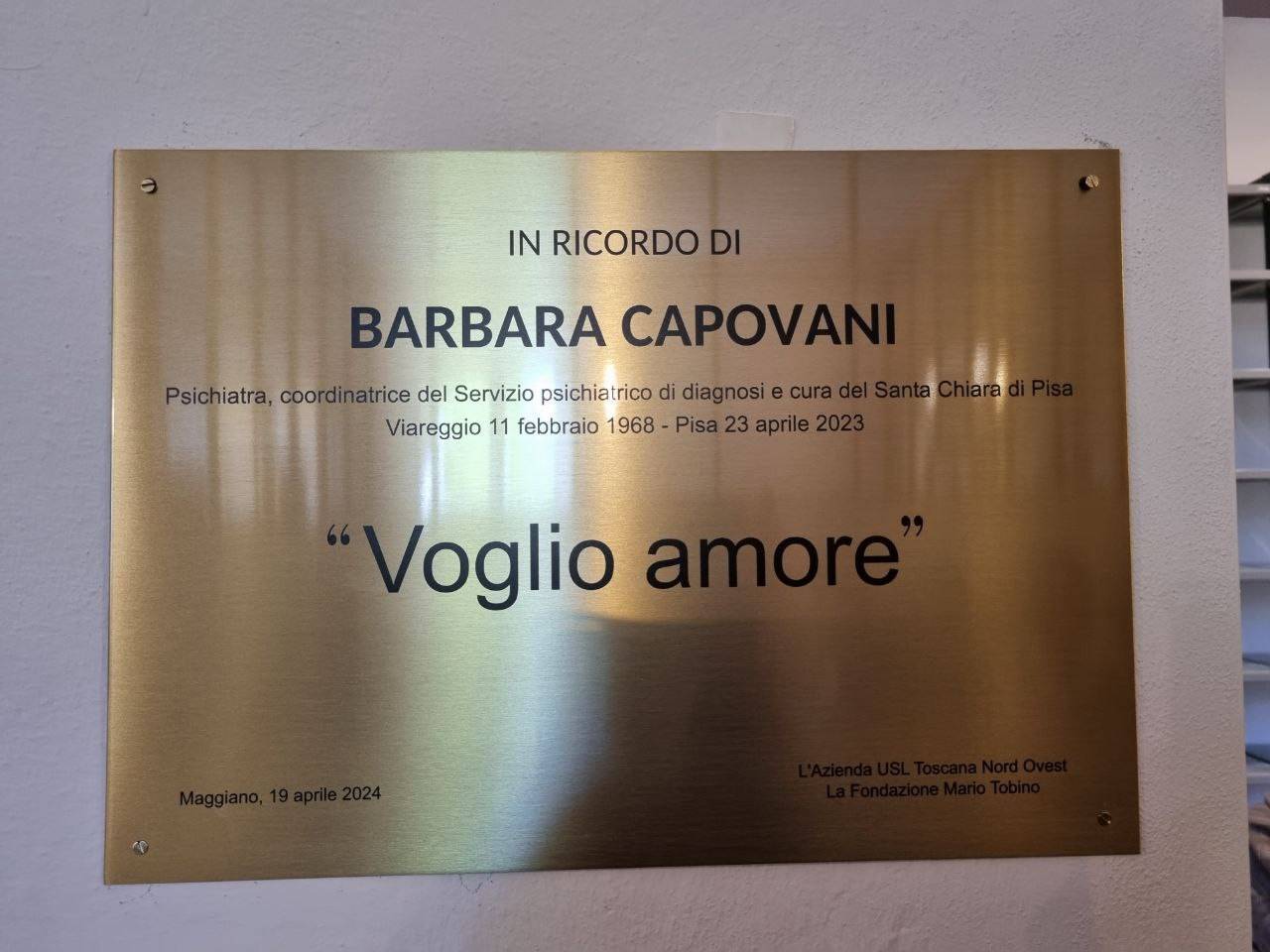 Alla presenza di rappresentanti della Fondazione Cassa di Risparmio di Lucca, del Comune di Lucca, dell’Asl, ma soprattutto di familiari e colleghi e di tanti professionisti della sanità, è stata scoperta (dal vicepresidente della Fondazione CRL Raffaele Domenici) una targa in cui campeggia la scritta “Voglio amore”, che vuole evidenziare il patrimonio di competenza ma soprattutto di straordinaria umanità che ha lasciato Barbara alla comunità e che non dovrà mai essere disperso o dimenticato.