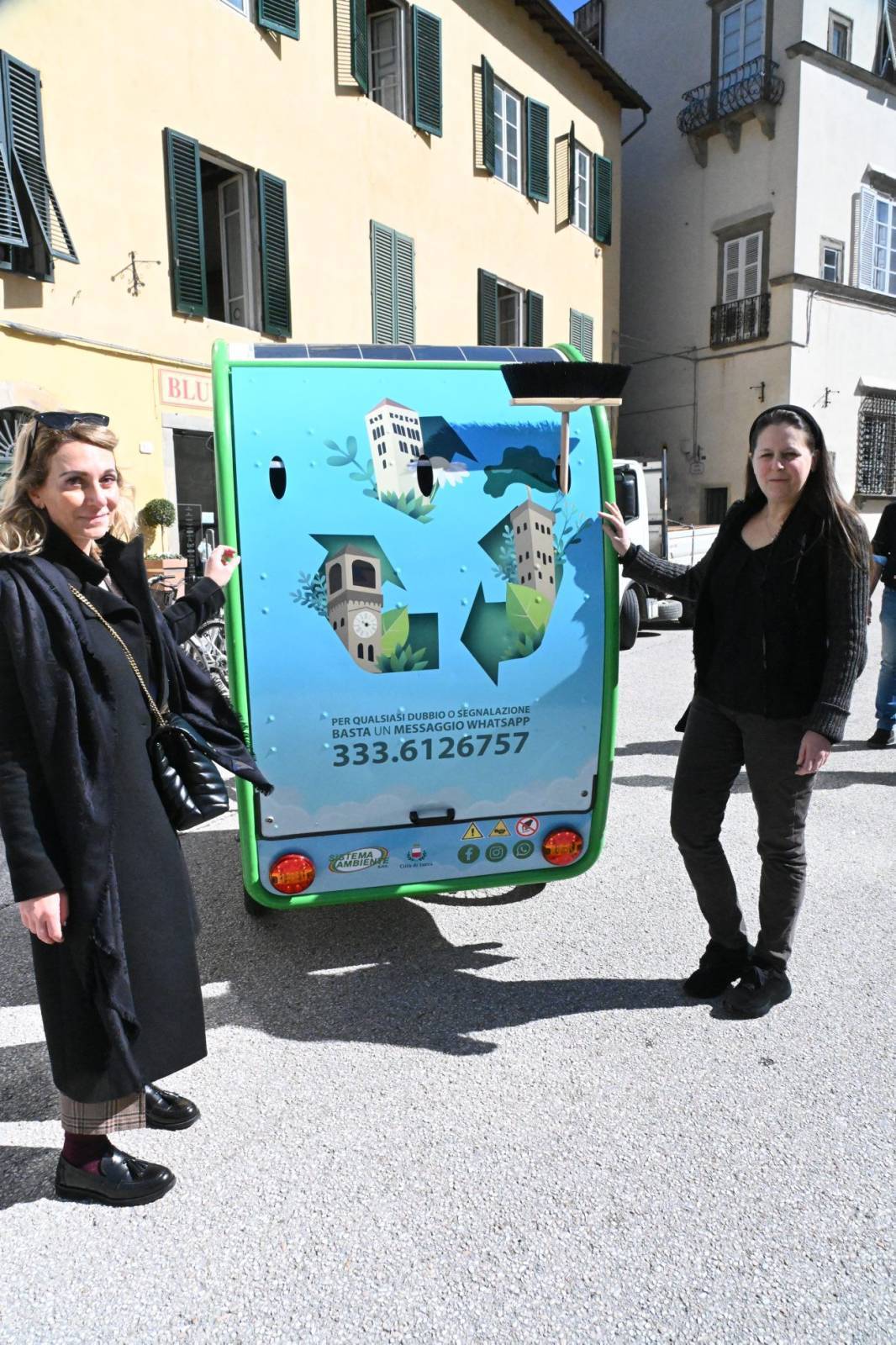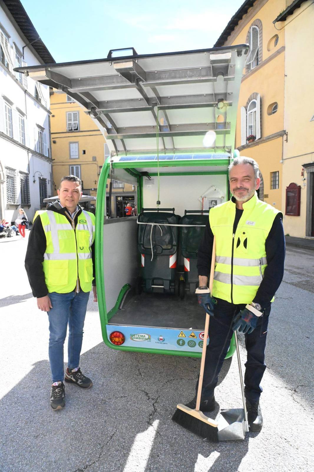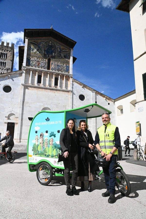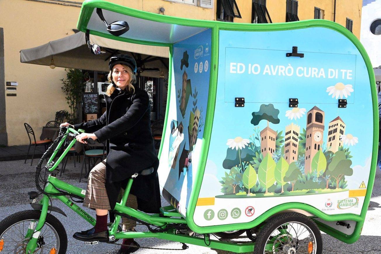 IL T-RICICLO. Brandizzato con colori vivaci che richiamano le torri e i monumenti-simbolo di Lucca, il T-Riciclo si muoverà esclusivamente nelle vie del centro storico. Si tratta di un mezzo a tre ruote, dotato di una piccola tettoia e di un vano retrostante dove si possono collocare due bidoni da 240 litri, oltre a spazzole, scope e altri accessori utili per la pulizia. All'interno dei bidoni saranno gettati i sacchi abbandonati, sporcizia in generale e altri rifiuti che potranno essere recuperati durante il giro. Il mezzo, ecologico e silenzioso, ha, inoltre, la pedalata assistita, un piccolo motore di bordo montato sul manubrio, pannelli fotovoltaici per la ricarica e cambio a sette rapporti per facilitare ulteriormente gli spostamenti.