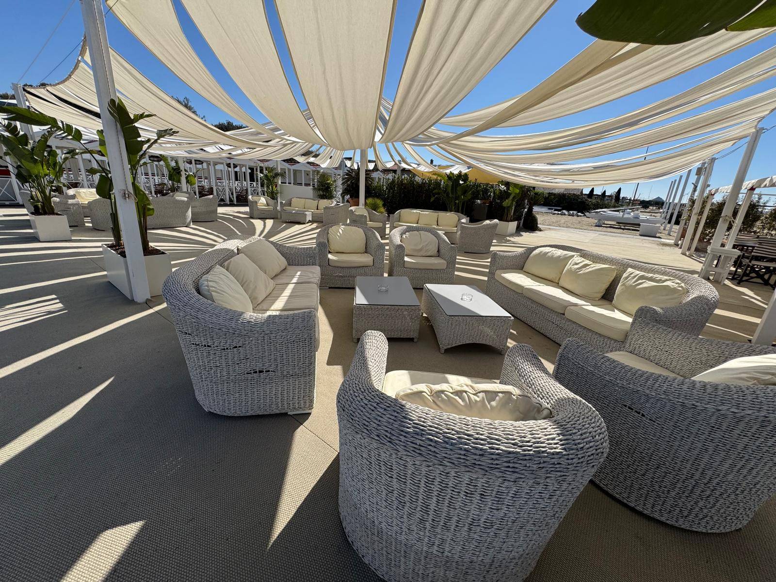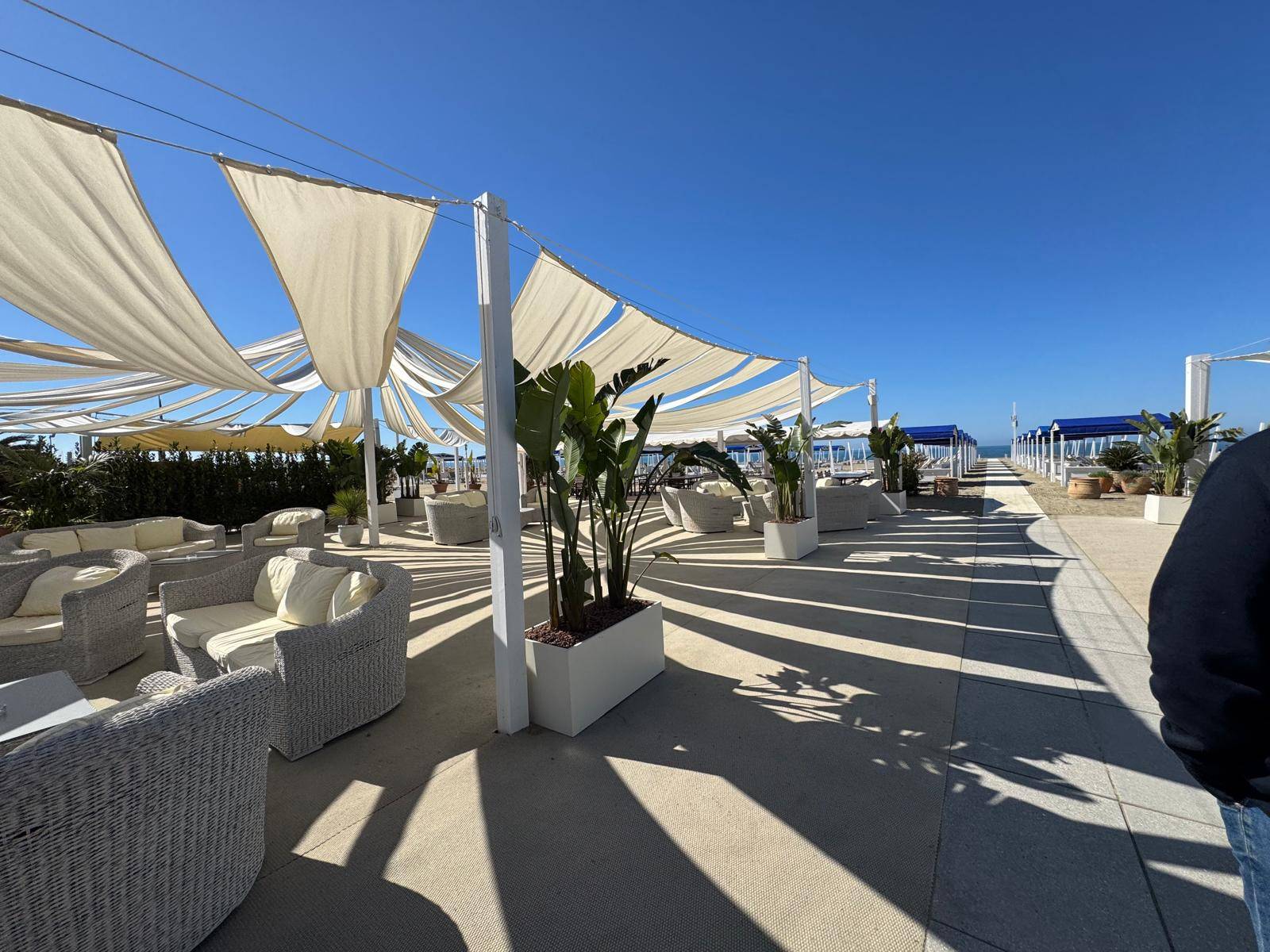 Il pranzo (o la colazione) è servito e il salato la fa da padrone. Il tutto vale davvero la pena. E si chiude con il dolce e la frutta, esotica e non. Poi, per chi ha un po' di tempo per godersi la vita, vista anche la giornata stupenda, attraversamento del tunnel sotto la strada principale che fiancheggia la spiaggia e visita al bagno dell'Augustus e al ristorante favoloso Bambaissa. Gli arredi sulla spiaggia sono fantastici, il bianco ecru su tutto.