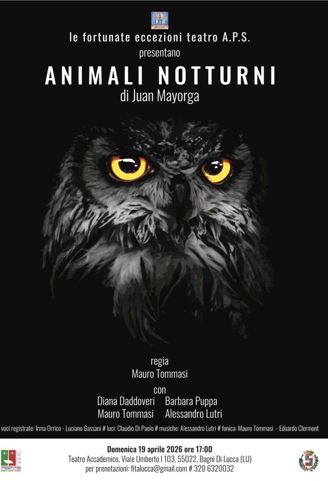 Il quinto appuntamento con la rassegna “Sipari di Comunità”, organizzata grazie alla collaborazione tra il Comune di Bagni di Lucca e la F.I.T.A. di Lucca, vedrà protagonista domenica 19 aprile alle ore 17, al Teatro Accademico, le attrici e gli attori della Compagnia Le Fortunate Eccezioni Teatro A.P.S. impegnati nella rappresentazione di “Animali Notturni”.