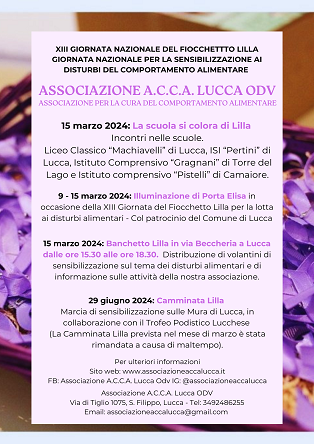 Il 15 marzo si celebra la Giornata del Fiocchetto Lilla, dedicata ormai da 13 anni alla sensibilizzazione e consapevolezza sui disturbi alimentari. L'associazione A.C.C.A. Lucca ODV - Associazione per la Cura del Comportamento Alimentare che si occupa di prevenzione e cura dei Disturbi dell’Alimentazione e Obesità, parteciperà all’evento con una serie di iniziative mirate.