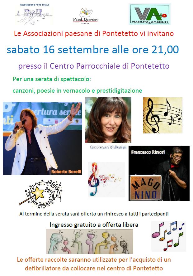 Il comitato Viabilità e ambiente e l'associazione Pons Tectus di Pontetetto in collaborazione con l’associazione Paesi e Quartieri di Lucca, invitano alla partecipazione ad una serata di musica, spettacolo e magia al centro parrocchiale di Pontetetto. L’evento sarà animato dalle canzoni di Roberto Borelli, intermezzi in vernacolo di Giovanna Vellutini e la magia di Francesco Ristori (in arte Mago Nino). Durante lo spettacolo saranno proiettate le immagini storiche e recenti di Pontetetto, dei suoi abitanti e degli eventi realizzati.