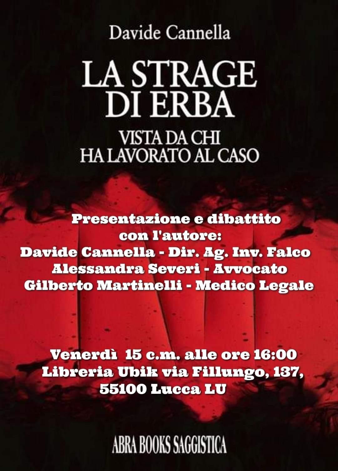 Questa settimana, il testo: "La strage di Erba" edito daAbra Books Saggistica, verrà presentato dall'AutoreDavide Cannella,dall'Avv. Alessandra Severi e dal Medico Legare Dott. Gilberto Martinelli , alla Libreria Lubik in Via Fillungo 137. L’appuntamento aperto al pubblico con presentazione e dibattito, si terrà Venerdi 15 Dicembre alle ore 16.