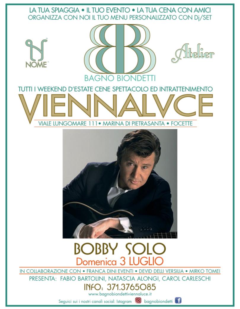 Domenica 3 luglio sarà una serata memorabile al Bagno Biondetti sul lungomare a Focette. Bobby Solo, il popolare cantante vincitore di due festival di Sanremo, si esibirà all'interno della splendida location allestita dalla famiglia Menici proprietaria sia dello stabilimento balneare sia del ViennaLuce, il loungebar all'ingresso. Grazie alla Franca Dini Eventi è stata possibile questa serata dedicata alla musica melodica che non conosce tempo.