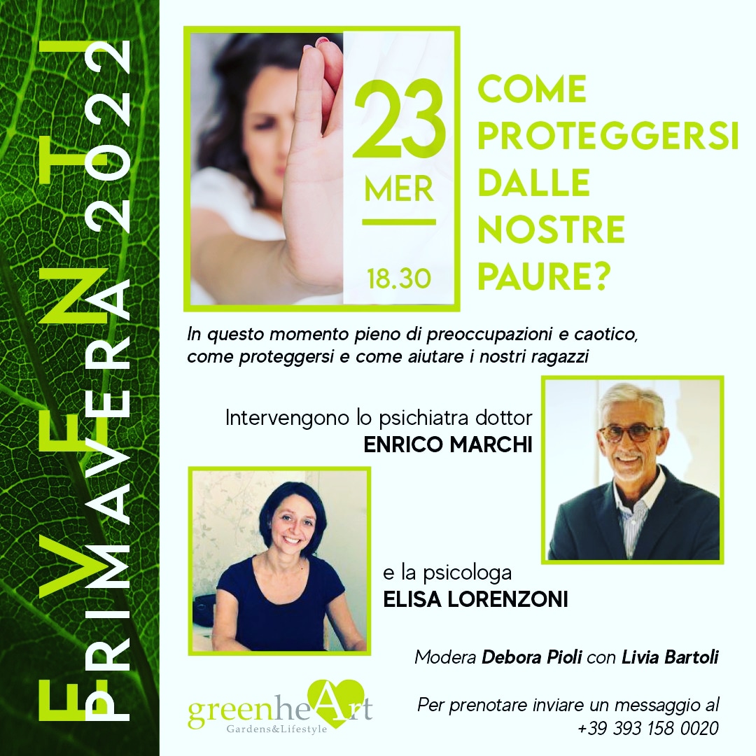 Mercoledì 23 marzo ore 18.30, sarà la volta della sessione di riflessione ed esercizio con lo psichiatra Enrico Marchi e la psicologa Elisa Lorenzoni. “Come proteggersi dalle paure?”, come proteggere anche i nostri figli, come fare ad affrontare le preoccupazioni legate alla crescita, alle tantissime incertezze del nostro presente storico, come filtrare le informazioni con consapevolezza, come gestire l’ansia e non mollare… Sono solo alcuni dei punti che verranno affrontati.