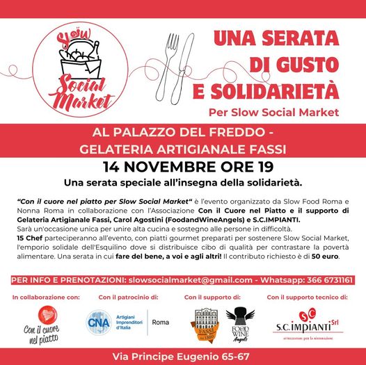 Il prossimo 14 novembre alle ore 19:00, le porte del celebre Palazzo del Freddo - Gelateria Artigianale Fassi, in Via Principe Eugenio 65-67, si apriranno per una speciale serata all’insegna della solidarietà: Con il cuore nel piatto per Slow Social Market. L’evento, organizzato da Slow Social Market, in collaborazione con Associazione Con il Cuore nel Piatto, Slow Food Roma, Nonna Roma e con il supporto di Gelateria Artigianale Fassi e Carol Agostini (FoodandWineAngels) sarà un'occasione unica per unire alta cucina e sostegno alle persone in difficoltà.