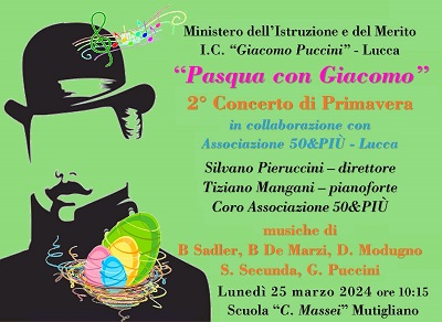 Nell’ambito del Progetto Musica dell’ Istituto Comprensivo G. Puccini a cura degli insegnanti referenti Prof. Antonio Della Santa e professoressa Lucia Coli, condiviso con la Dirigente Scolastica e le Responsabili di plesso Prof.sse Marilena Ridolfi e Carmen Ziino, si terrà il giorno 25 marzo alle ore 10,15 presso la Scuola C. Massei di Mutigliano il “2° Concerto di Primavera” in collaborazione con associazione 50&PIU’ - Lucca, dedicato alle musiche corali di B. Sadler - B. De Marzi - D. Modugno - S. Secunda - G. Puccini.