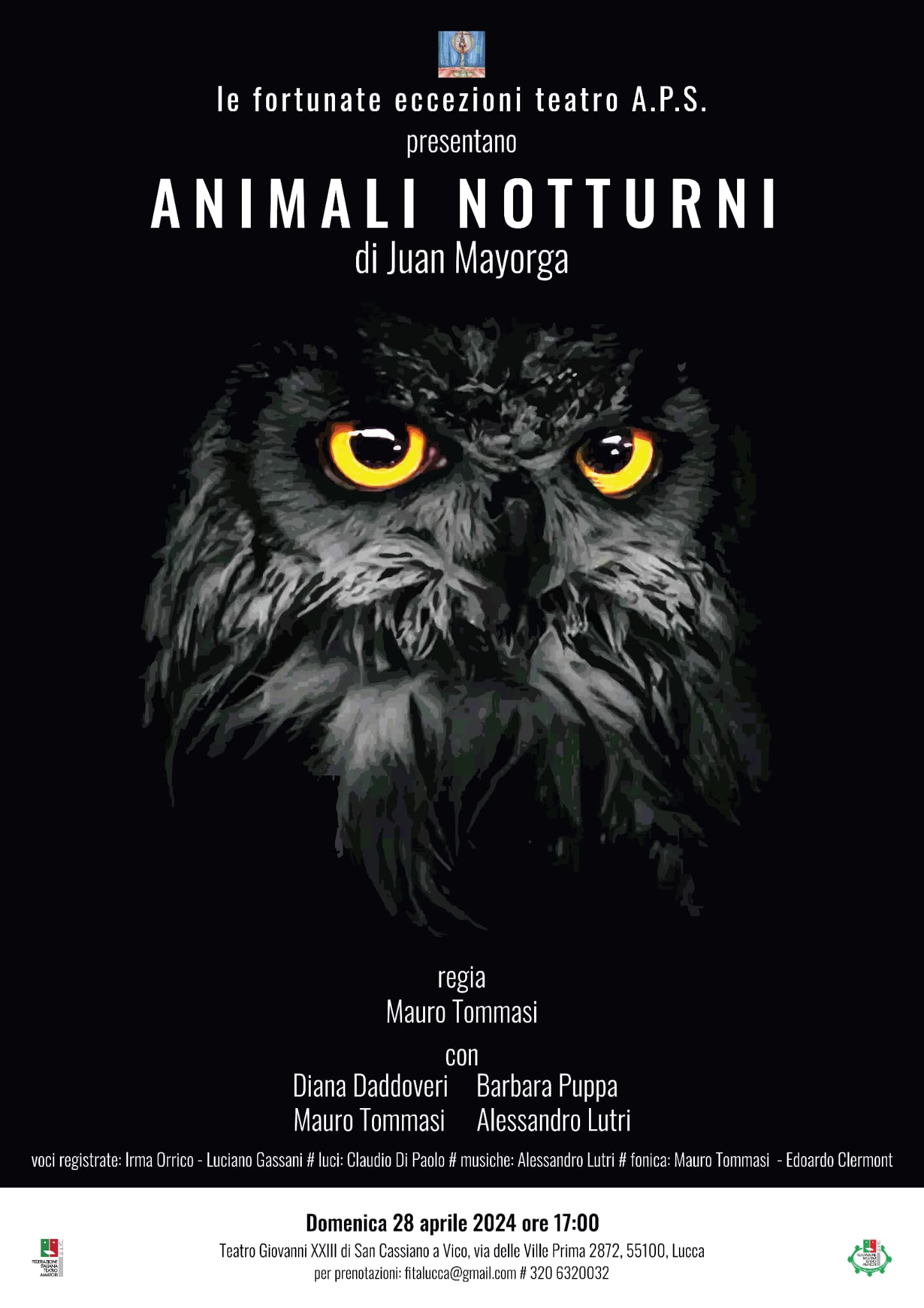 Domenica 28 aprile, alle ore 17, al Teatro Giovanni XXIII di San Cassiano a Vico, la Compagnia Le Fortunate Eccezioni Teatro metterà in scena, IN PRIMA ASSOLUTA, ‘Animali notturni’ di Juan Mayorga. Un testo difficile da rendere nelle consuete sinossi, comunque, una storia di uomini e donne le cui vite sono dominate dal segreto e dalla solitudine. «Due ombre s’incrociano ogni mattina per le scale finché un giorno…». È questa la battuta-chiave di «Animali notturni» pronunciata da uno dei due personaggi maschili, e i puntini sospensivi, che traducono una minaccia inespressa ma evidente, alludono all’evento da cui l’autore, uno dei maggiori drammaturghi spagnoli contemporanei, ha tratto spunto. Lo spettacolo propone con estrema lucidità il tema della solitudine esistenziale, malamente riempita dall’abitudinarietà e dall’incapacità di reagire ai ricatti affettivi con i quali puntelliamo quotidianamente la paura della solitudine stessa, al punto da costruire e percorrere una vita basata su rapporti, sostanzialmente, falsi e precari.