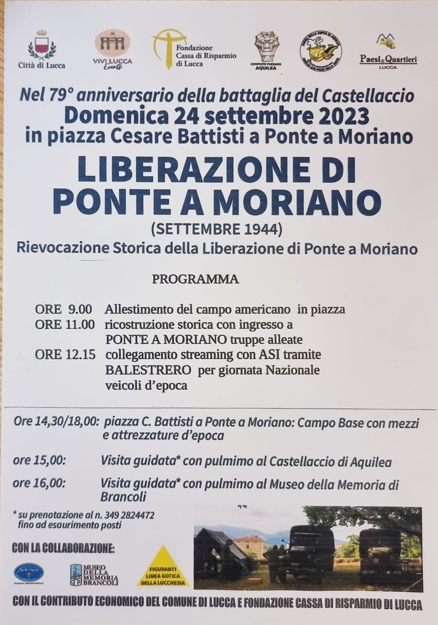Domenica 24 settembre dalle 9 alle 18.30 nella piazza Cesare Battisti località Ponte a Moriano, nell'ambito delle manifestazioni in ricordo della liberazione della Lucchesia dall'oppressione tedesca sarà montato un campo base con mezzi d'epoca e figuranti in divisa americana con la possibilità di vedere da vicino i mezzi e le attrezzature dell' esercito americano del 1944.