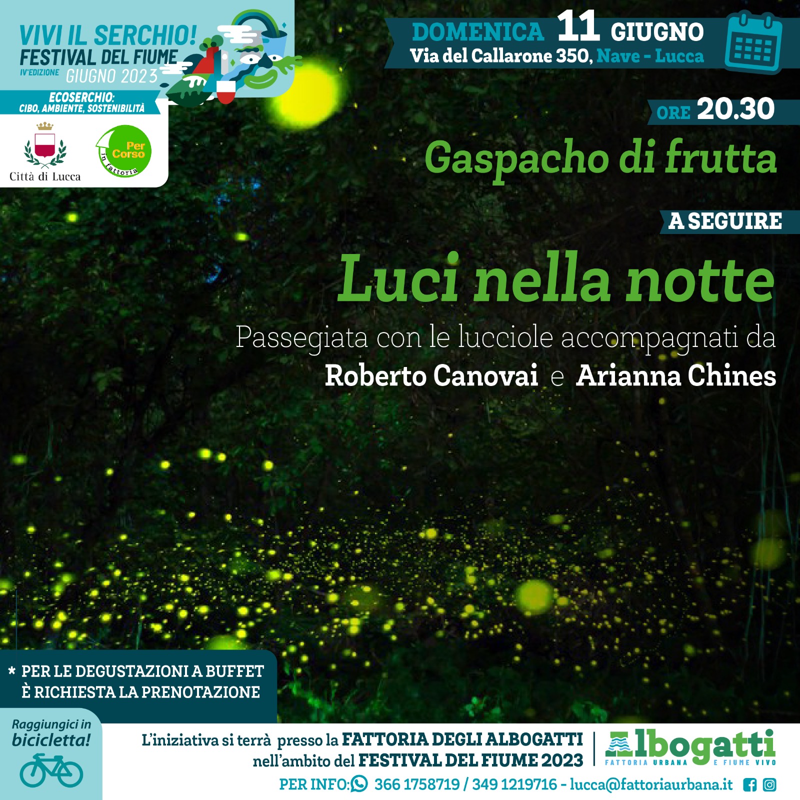 Domenica 11 giugno ore 20,30 "Luci nella notte" passeggiata in notturna lungo il Serchio, per ammirare lo spettacolo delle lucciole ed ascoltare i canti degli uccelli, in compagnia di Roberto Canovai e Arianna Chines. Prima della partenza, breve introduzione e degustazione di Gaspacho di frutta. E' gradita la prenotazione
