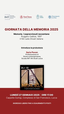 "E' avvenuto, quindi può accadere di nuovo: questo è il nocciolo di quanto abbiamo da dire", scriveva Primo Levi. Facendo proprio il suo monito, in occasione della Giornata della Memoria, la Scuola IMT Alti Studi Lucca, la Scuola Superiore Sant'Anna, la Scuola Normale Superiore e l'Università di Pisa organizzano, per lunedì 27 gennaio, la proiezione di "Memoria. I sopravvissuti raccontano", film del 1997 sulla Shoah italiana, per la regia di Ruggero Gabbai, con il soggetto di Liliana Picciotto e Marcello Mezzetti. La proiezione, aperta al pubblico, avviene alle 17 nella Cappella Guinigi della Scuola IMT, nel complesso di San Francesco e alle 18 nell'aula magna della Scuola Superiore Sant'Anna, a Pisa.