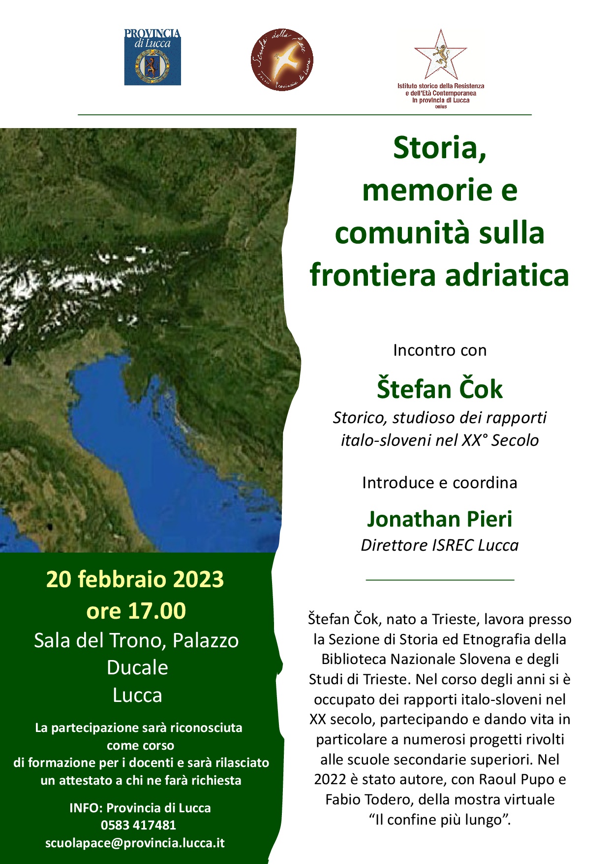 E' in programma per lunedì 20 febbraio alle 17.00 nella sala del Trono a Palazzo Ducale l'incontro pubblico con Štefan Čok sul tema 'Storia, memorie e comunità sulla frontiera adriatica' che rientra nell'ambito degli appuntamenti organizzati e promossi dalla Provincia per il Giorno del Ricordo. L'incontro sarà introdotto e moderato da Jonathan Pieri, direttore dell'Istituto storico della Resistenza e dell'età contemporanea in provincia di Lucca.