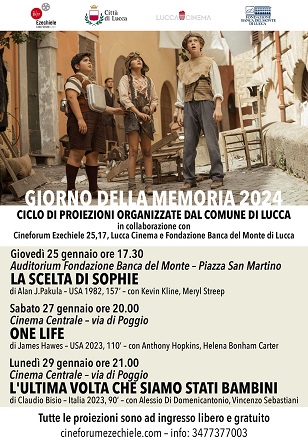 In occasione del Giorno della Memoria l’amministrazione comunale, in collaborazione con il Cineforum Ezechiele 25,17, Lucca Cinema e Fondazione Banca del Monte di Lucca, promuove la proiezione di tre pellicole a tema.