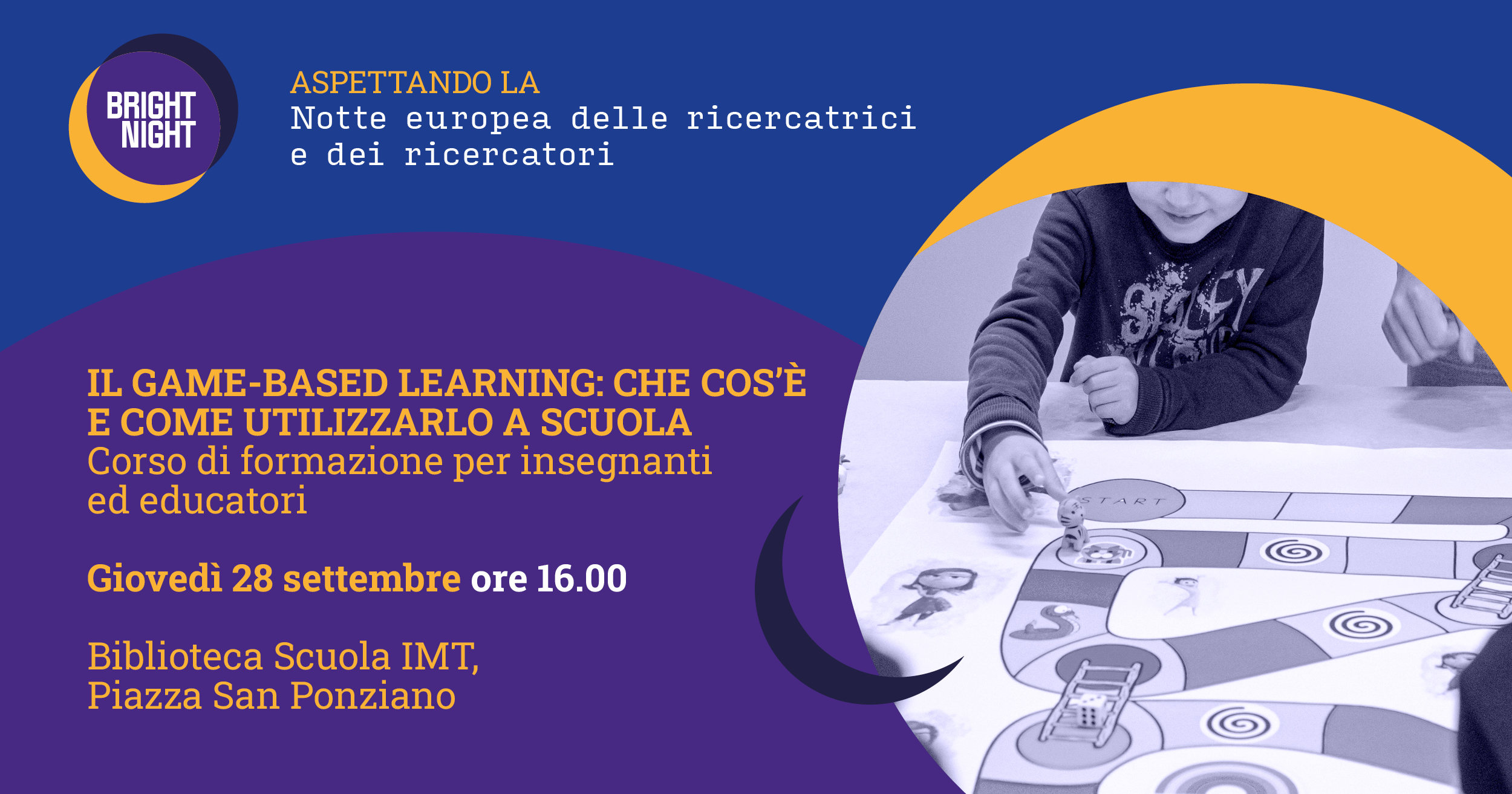 Alle ore 16 nei locali della biblioteca della Scuola IMT, l'appuntamento è per gli insegnanti ed educatori con un corso di formazione per insegnanti ed educatori sul tema dell'apprendimento attraverso l'uso del gioco e ai modi per utilizzarlo nelle organizzazioni educative e scolastiche, il tutto a cura del Game Science Research Center della Scuola IMT.
