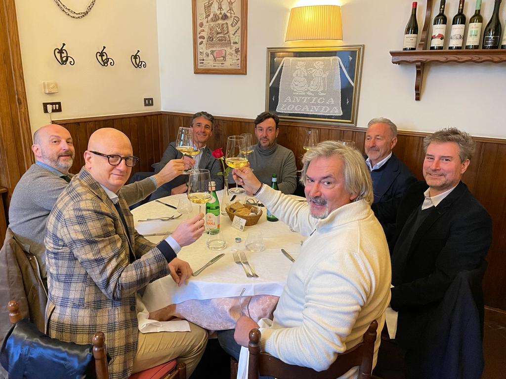 Côte à côte del promotore dell'iniziativa, Marco Simonetti, medico dentista titolare dello studio Santa Apollonia di Porcari insieme a Rosaria Sommariva. Simonetti è un amico e una bella persona, innamorato sportivamente del basket - ma è un problema suo - è stato tra coloro che hanno dato l'anima e anche qualche soldino per la pallacanestro lucchese salvo, poi, restare così deluso da tirarsi indietro e non pensarci più. Ciònonostante si reca al Palatagliate per vedere i beniamini della palla a spicchi. Si trova vicino, senza conoscerlo, Piero Pacini, gelatiere e non gelataio. A proposito di gelati: durante un pomeriggio di un lunedì di inizio febbraio, in un'ora che siamo stati dentro al suo locale di via Roma, non c'è stato un momento di sosta nell'affluenza dei suoi aficionados, addirittura in fila per attendere di degustare il gelato tra i più buoni di questa zona terracquea. Piero Pacini è stato tra i primi ad iscriversi a Luca 2032, il movimento politico fondato da Mario Pardini e Beniamino Placido, tessera numero 122. Poi, però, l'adesione è scemata fino, addirittura, al video promozionale con cui, poco prima del voto, lo stesso Pacini si è speso a favore del candidato di sinistra Francesco Raspini. Qui a tavola, tuttavia, nessun rancore e tutti amici come prima.