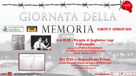 Nel pomeriggio di sabato 27, alle 17, il centro studi GLS partecipa a un evento teatrale che l’ANPI realizza con l'adesione della CGIL locale presso la sala conferenze in via San micheletto, 3 a Lucca. Sarà ricordata la figura di Primo Levi attraverso una performance teatrale e musicale di e con Igor Vazzaz, "Rapsodia per Primo", con Jacopo Crezzini e Luca Giovacchini.