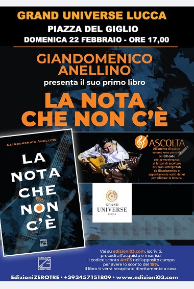 Domenica 22 febbraio alle ore 17, presso l'hotel Grand Universe Lucca in Piazza del Giglio, il chitarrista Giandomenico Anellino presenterà il suo primo libro "La nota che non c’è".