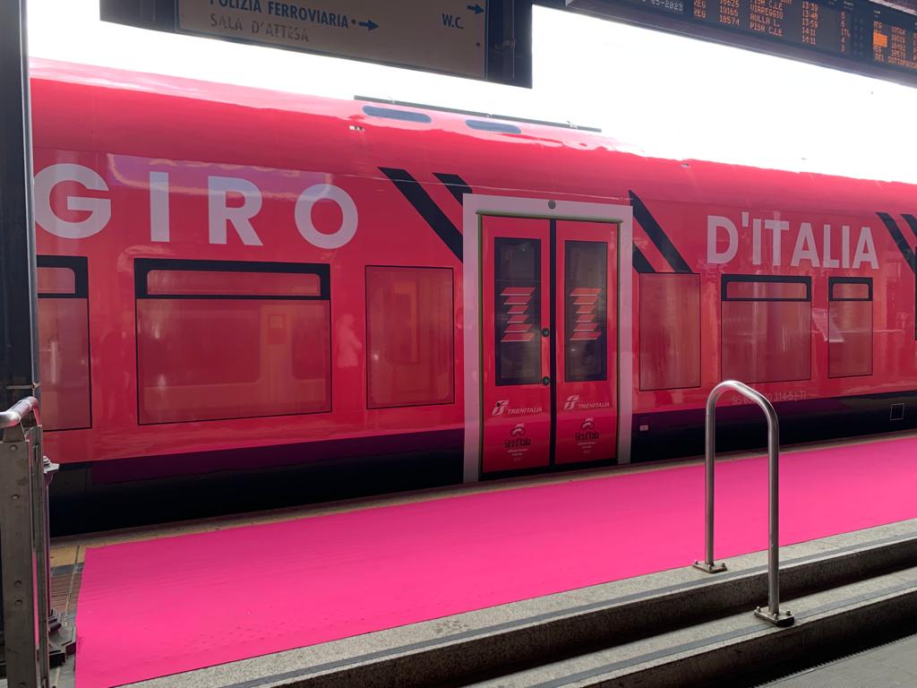 Proviamo a seguire il Giro d’Italia sempre con una carovana, tutta raccolta però, in un convoglio ferroviario, che fiancheggia la vera carovana rosa: quella del Giro d’Italia.