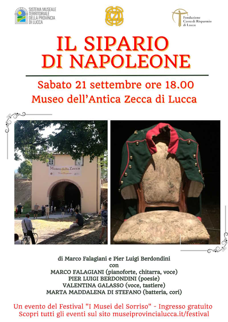 L'appuntamento con "Il sipario di Napoleone" a cura di Marco Falagiani è sabato 21 settembre alle 18 al Museo dell'Antica Zecca di Lucca, dove Marco Falagiani (pianoforte, chitarra, voce), Pier Luigi Berdondini (poesie), Valentina Galasso (voce, tastiere) e Marta Maddalena Di Stefano (batteria, cori) racconteranno "il backstage" della vita dell'Imperatore attraverso la voce di Antonio Revelli, pittore. L'evento è a cura del Museo dell'Antica Zecca di Lucca.
