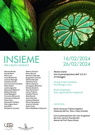 Un bellissimo evento nella chiesa di San Cristoforo via Fillungo a Lucca organizzato dall’associazione UCAI di Lucca, una mostra di pittura dal titolo INSIEME … Per il Beato Angelico. Perché Insieme? Perché si sono uniti in questa occasione anche la sezione UCAI di Viareggio, per il Beato Angelico è il 18 febbraio ed è il patrono degli artisti.