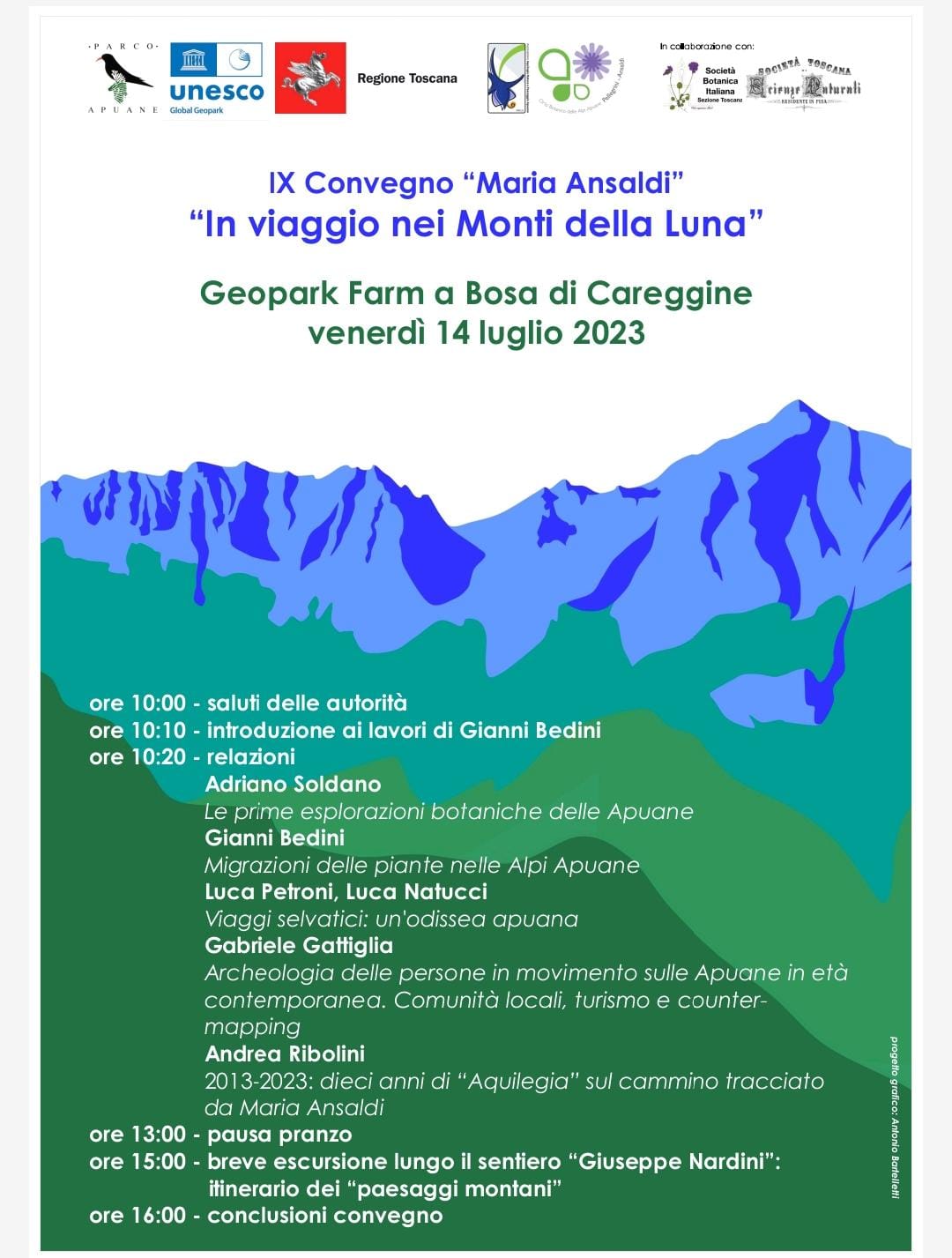 I lavori cominceranno alle ore 10 con i saluti delle Autorità. Dopo l'intervento introduttivo del prof. Gianni Bedini, seguiranno le relazioni di Adriano Soldano dal titolo “Le prime esplorazioni botaniche delle Apuane”; Gianni Bedini su “Migrazioni delle piante nelle Alpi Apuane”; Luca Petroni, Luca Natucci su “Viaggi selvatici: un'odissea apuana”; Gabriele Gattiglia su “Archeologia delle persone in movimento sulle Apuane in età contemporanea. Comunità locali, turismo e counter-mapping”. Infine, Andrea Ribolini su “2013-2023: dieci anni di “Aquilegia” sul cammino tracciato da Maria Ansaldi”.