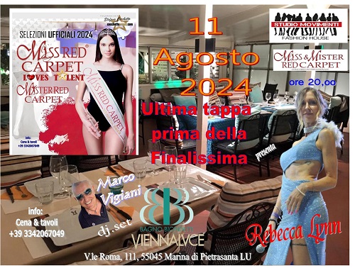 Moda, talento e musica saranno al centro della serata dell’11 agosto al Bagno Biondetti-Vienna Lvce di Marina di Pietrasanta (viale Roma 111, zona Focette): a partire dalle 20 si terranno infatti le selezioni ufficiali del concorso Miss Red Carpet, ultima tappa prima della finale nazionale.