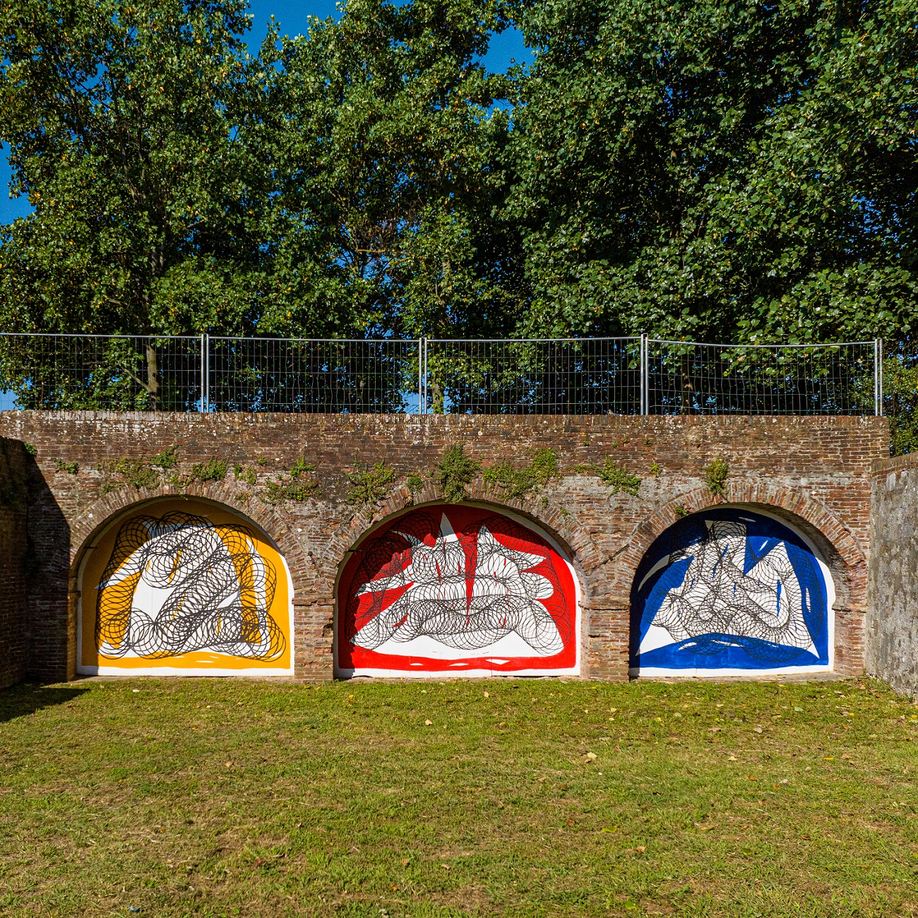 Si apre infatti la seconda fase di Labirinto, mostra a cura di Gian Guido Grassi, inaugurata lo scorso maggio a Palazzo delle Esposizioni, che ha accolto per due mesi le opere di Moneyless, Tellas e StenLex. Dal mese di settembre gli artisti coinvolti saranno protagonisti di una nuova installazione site specific all'interno della monumentale Chiesa dei Servi (ingresso libero, fino a domenica 15 ottobre) e di un percorso outdoor tra le piazze del centro storico e le antiche mura. L'itinerario si snoda tra piazza San Martino, dove la cattedrale fronteggia l'opera del duo StenLex, piazzale Verdi, sede dell'edificio dismesso della Manifattura Tabacchi, sulle cui finestre Tellas ha fatto sorgere un giardino in bianco e nero, l'iconica Torre delle Ore in Via Fillungo e il Baluardo San Donato. Qui, dove un tempo erano posizionate le cannoniere, Moneyless apre un varco tra geometria e natura, scoprendo parallelismi e punti di rottura.