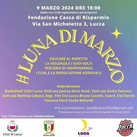 Una brillante iniziativa organizzata da Anna Dovere e un nutrito gruppo di professionisti per affrontare i tanti volti della violenza di genere con la collaborazione del Centro antiviolenza Luna, il patrocinio del Comune di Lucca e la partecipazione del Basketball Club Lucca. Il convegno Luna di Marzo si terrà il 9 marzo alle ore 18 presso la Fondazione Cassa di Risparmio di Lucca, con lo scopo di supportare e continuare l’intensa attività di sensibilizzazione e riflessione sul fenomeno della violenza di genere in cui è impegnato il Centro Luna nella Piana di Lucca dal 1999, anno di fondazione del centro ad opera della presidente Daniela Elena Caselli.