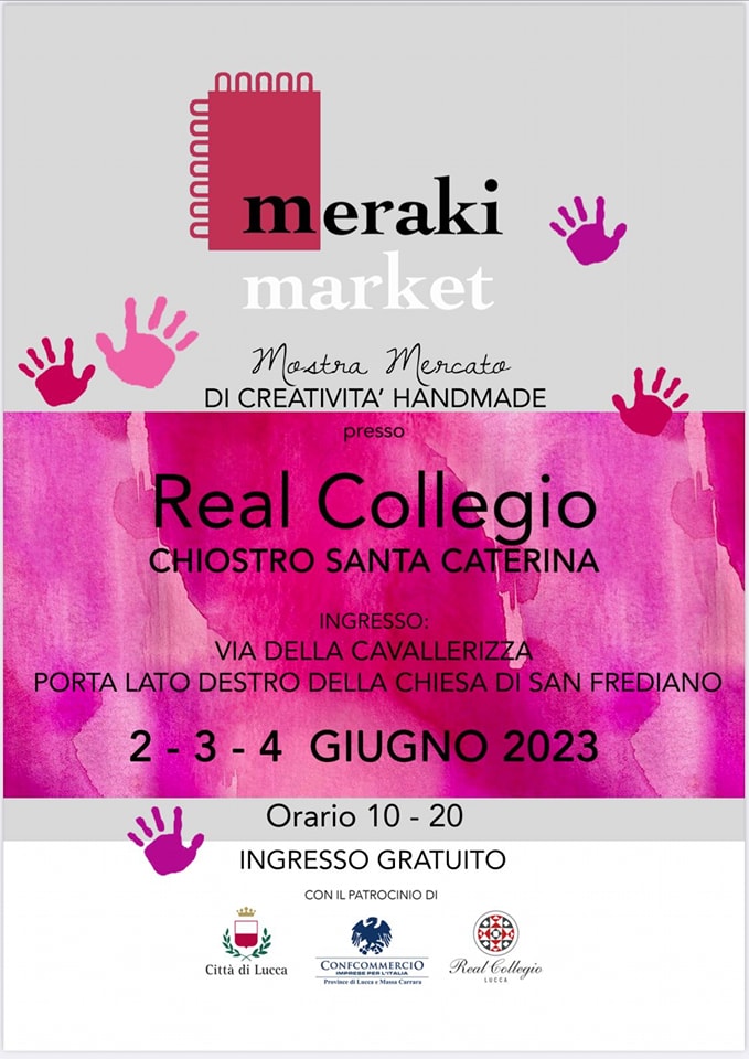 Il prossimo appuntamento con Meraki Market sarà il 2, 3, 4 giugno al Portico di Santa Caterina, Real Collegio, Lucca. Un'occasione speciale per ammirare le novità di artisti e creativi dell'Associazione Meraki Lucca e per visitare il meraviglioso chiostro aperto al pubblico solo in eventi di questo tipo.