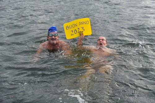 Questa volta il sole ha baciato il tutto dei coraggiosi anche se dobbiamo, onestamente, dire che la temperatura esterna era di 16°, prinaverile, e l'acqua poco meno quindi un bagno in tutta tranquillità. Noi siamo entrati per primi e siamo usciti per ultimi essendo rimasti a nuotare 30 minuti esatti.