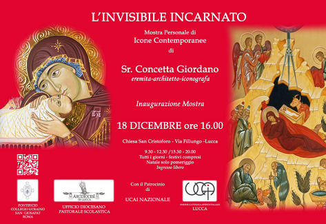 Il 18 dicembre, alle ore 16 nella chiesa di San Cristoforo a Lucca, sarà inaugurata la mostra di icone contemporanee: «L’Invisibile Incarnato». Dopo i saluti di Francesca Bettaccini, presidente Ucai di Lucca, e di Maurizio Zerini, presidente Nazionale Ucai, interverranno: mons. Paolo Giulietti, Arcivescovo di Lucca, p. Liviu Marina, parroco della Parrocchia Ortodossa Romena Sant’Antonio il Grande di Lucca e, infine, l’autrice delle icone sr. Concetta Giordano. La mostra intitolata «L’invisibile incarnato», ad ingresso libero, resterà aperta tutti i giorni fino al 30 dicembre dalle 9.30 alle 12.30 e dalle 15.30 alle 20. Il 25 dicembre sarà aperta solo il pomeriggio. Altri appuntamenti importanti però si terranno nella stessa chiesa durante l’esposizione.