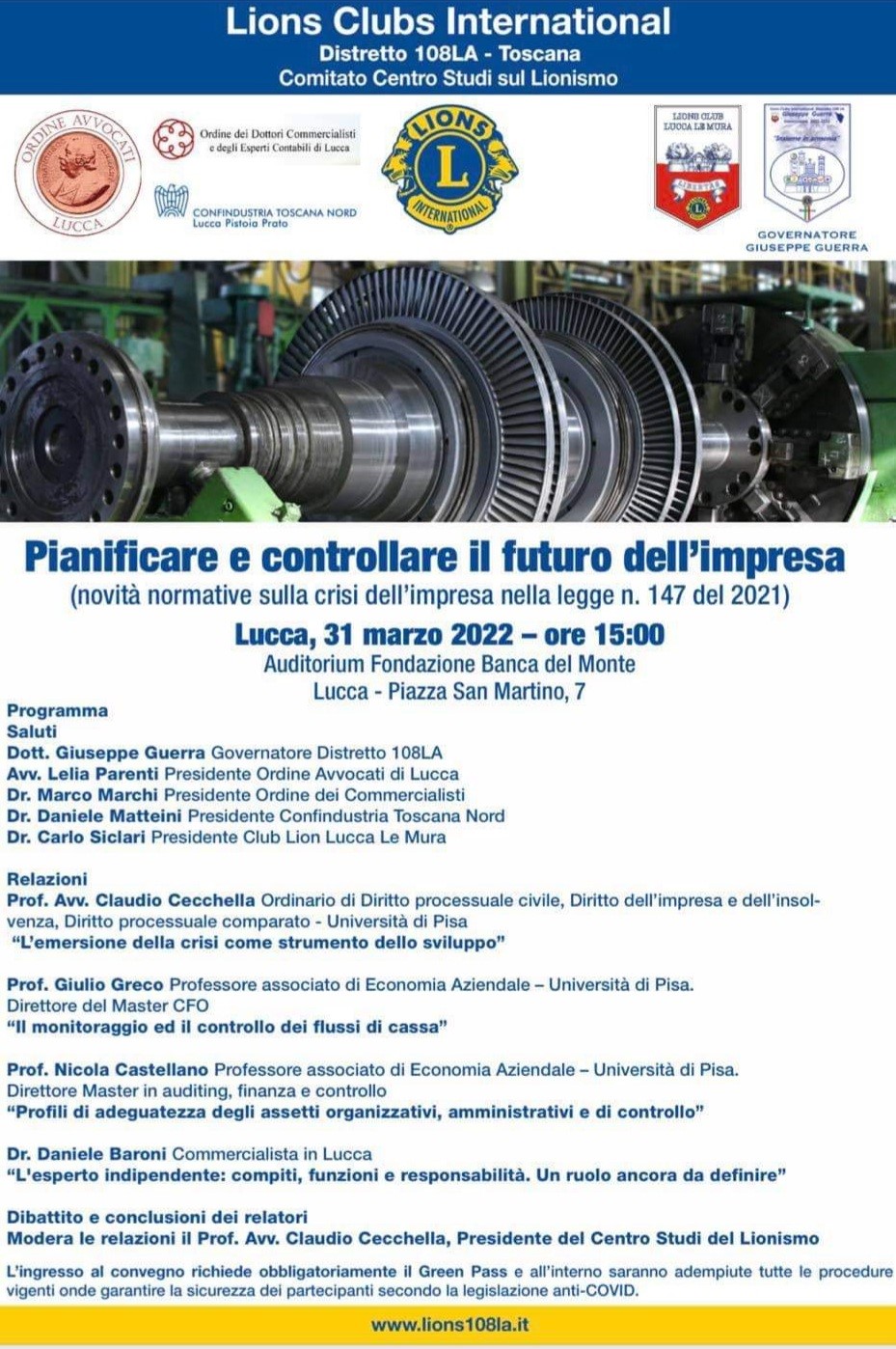Si tiene a Lucca un convegno organizzato dal centro studi lionistici del distretto toscano con il patrocinio dell'ordine degli avvocati di Lucca, dell'ordine dei commercialisti di Lucca e della Confindustria Toscana Nord - Lucca, Pistoia e Prato dal titolo "Pianificare e controllare il futuro dell'impresa (novità normative sulla crisi dell'impresa nella legge n. 147 del 2021)".